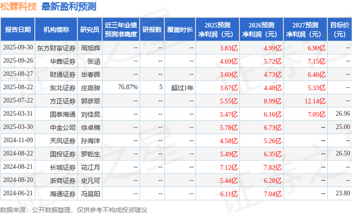 证券之星数据中心根据近三年发布的研报数据计算,东北证券庄嘉骏研究员团队对该股研究较为深入,近三年预测准确度均值为76.87%,其预测2025年度归属净利润为盈利3.67亿,根据现价换算的预测PE为36.45。