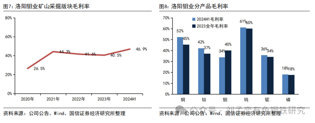 从成本来看,2024H1公司矿产铜成本30600元/吨,比去年34500元/吨有明显下降,符合今年上半年全球铜矿山成本下降大趋势,公司铜矿产量大幅增长也摊低了部分固定成本,规模效应显现。2024H1钴成本49300元/吨,比2023年成本下降22850元/吨。钼、钨、磷的成本比2023年上升,其中2024H1钨生产成本85500元/吨,比2023年增加9500元/吨。