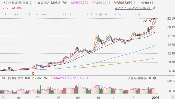 格隆汇1月9日|A股市场有色金属股继续强势,其中,入选了格隆汇2026年“下注中国”十大核心资产名单的洛阳钼业(603993.SH)盘中涨5.5%报22.89元,再创历史新高。该股在2025年累涨210%后,今年在截至今日的5个交易日内再度累涨超14%。