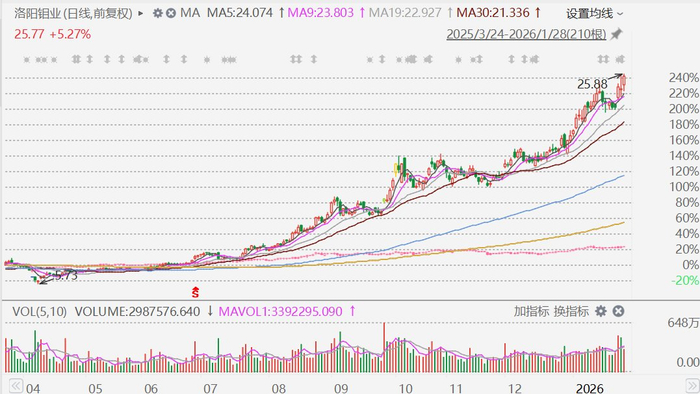格隆汇1月28日|入选了格隆汇2026年“下注中国”十大核心资产名单的洛阳钼业港股今日盘中涨4%至23.8港元,A股涨近6%至25.88元,AH股齐创历史新高,总市值突破5300亿港元。消息面上,现货黄金价格升至5247美元/盎司的历史新纪录。