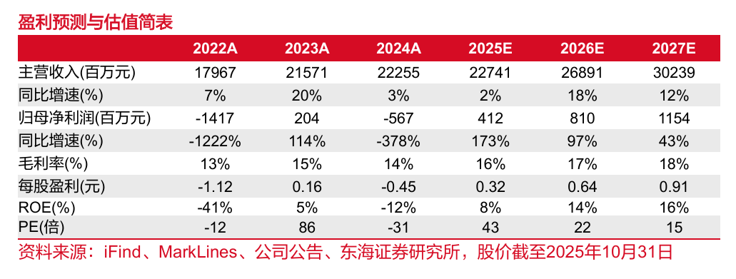 投资建议:基于新项目的量产节奏及公司盈利水平,我们调整公司2025-2026年盈利预测并新增2027年盈利预测,预计2025-2027年实现归母净利润4.12亿元、8.10亿元、11.54亿元(原2025/2026年预测分别为8.90/12.12亿元),对应EPS为0.32、0.64元、0.91元(原2025/2026年预测分别为0.70/0.96元),按2025年10月31日收盘价计算,对应PE为43X、22X、15X。公司作为国内汽车座椅头枕头部企业,我们看好乘用车座椅总成等新兴业务为公司中长期带来的业绩增量以及格拉默整合向上对盈利端的优化,维持“买入”评级。