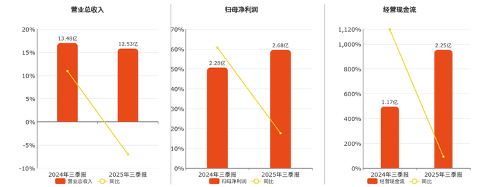 公司营业总收入为12.53亿元,较去年同报告期营业总收入减少9464.79万元,同比较去年同期下降7.02%。归母净利润为2.68亿元。经营活动现金净流入为2.25亿元。