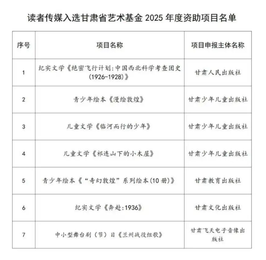 读者传媒7个项目入选甘肃省艺术基金2025年度资助项目名单