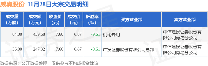 证券之星消息,11月28日威奥股份发生大宗交易,交易数据如下:
