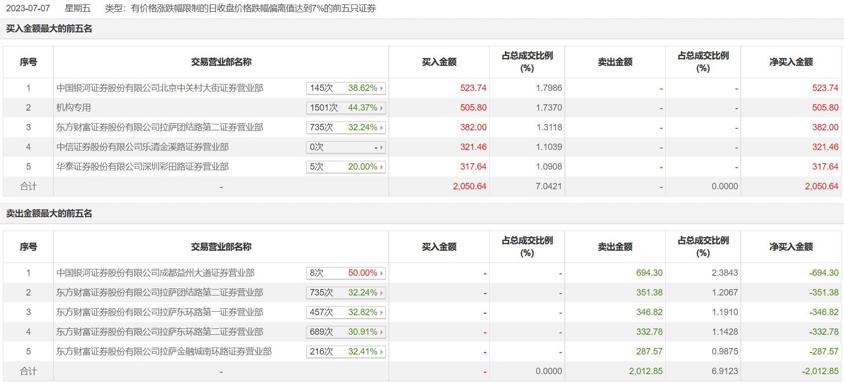 合兴股份7月7日跌停,龙虎榜数据显示,上榜营业部席位全天成交4063.49万元,占当日总成交金额比例为13.95%。其中,买入金额为2050.64万元,卖出金额为2012.85万元,合计净买入37.79万元。