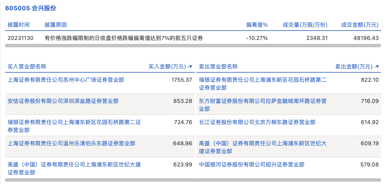 11月30日,合兴股份今日跌停,龙虎榜数据显示,上榜营业部席位全天成交7947.75万元,占当日总成交金额比例为16.49%。其中,买入金额为4606.36万元,卖出金额为3341.39万元,合计净买入1264.97万元。