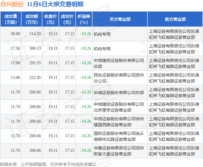 证券之星消息,11月6日合兴股份发生大宗交易,交易数据如下: