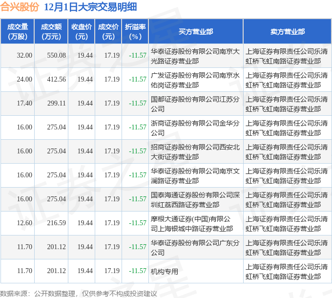12月1日合兴股份现10笔折价11.57%的大宗交易 合计成交2980.74万元