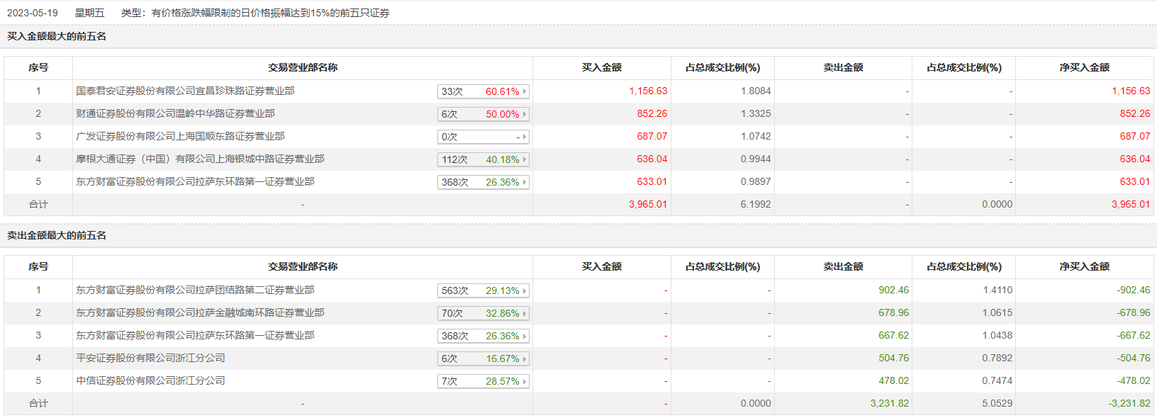 具体来看,国泰君安证券宜昌珍珠路证券营业部、财通证券温岭中华路证券营业部分别买入1156.63万元、852.26万元;东方财富证券拉萨团结路第二证券营业部、东方财富证券拉萨金融城南环路证券营业部分别卖出902.46万元、678.96万元。