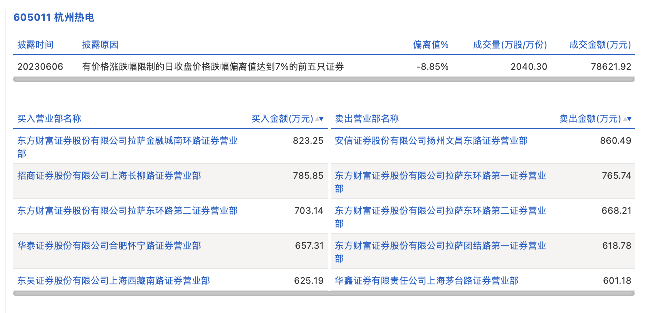 6月5日,杭州热电今日跌停,龙虎榜数据显示,上榜营业部席位全天成交7109.13万元,占当日总成交金额比例为9.04%。其中,买入金额为3594.73万元,卖出金额为3514.4万元,合计净买入80.34万元。