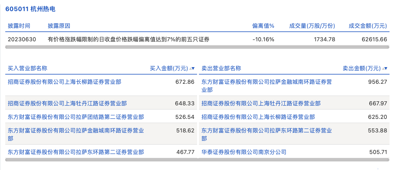 6月30日,杭州热电今日跌9.54%,龙虎榜数据显示,上榜营业部席位全天成交6143.15万元,占当日总成交金额比例为9.81%。其中,买入金额为2834.12万元,卖出金额为3309.04万元,合计净卖出474.92万元。