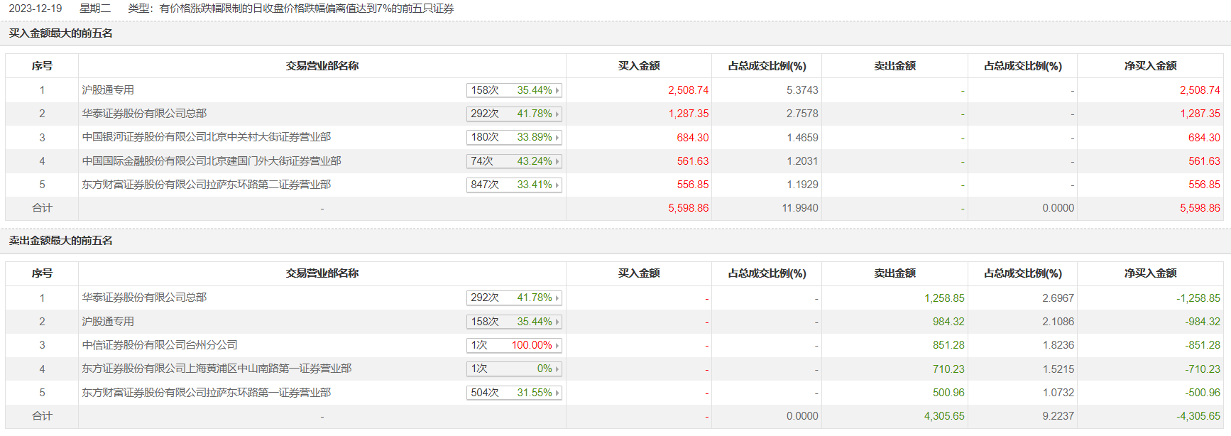 杭州热电12月19日跌停,全天换手率达13.87%,振幅达10.71%。龙虎榜数据显示,营业部席位合计净买入1293.22万元。其中,华泰证券总部、沪股通专用分别卖出1258.85万元、984.32万元;沪股通专用、华泰证券总部分别买入2508.74万元、1287.35万元。