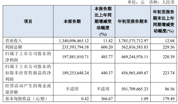 报告显示,永和股份前三季度营业收入为37.86亿元,同比增长12.04%;归母净利润为4.69亿元,同比增长220.39%;扣非归母净利润为4.57亿元,同比增长223.74%;基本每股收益1.09元。其中第三季度,永和股份营业收入为13.40亿元,同比增长11.42%;归母净利润为1.98亿元,同比增长485.77%;扣非归母净利润为1.89亿元,同比增长440.37%;基本每股收益0.42元。
