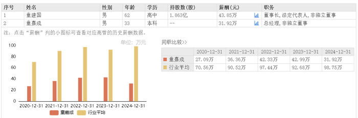据东方财富网数据,永和股份总经理童嘉成2024年所获薪酬为31.92万元,相较上年薪酬42.99万元降薪25.75%。