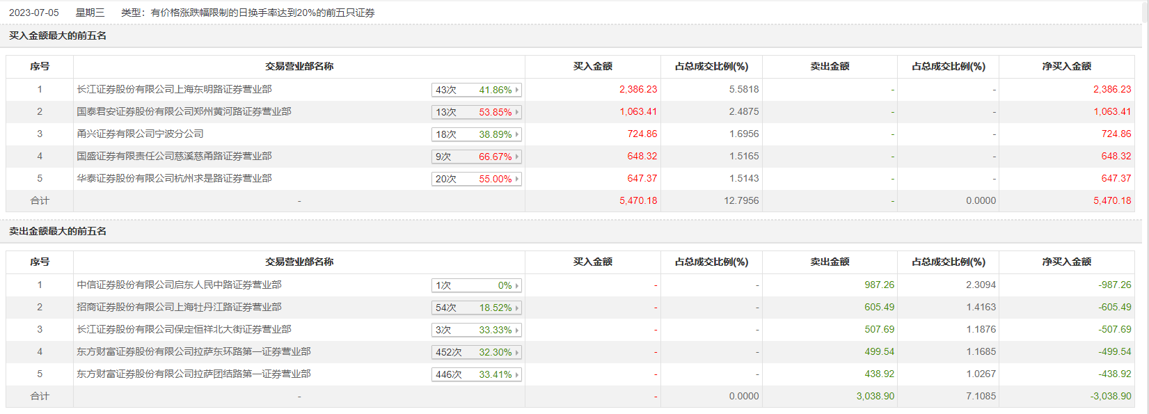 具体来看,长江证券上海东明路证券营业部、国泰君安证券郑州黄河路证券营业部分别买入2386.23万元、1063.41万元;中信证券启东人民中路证券营业部、招商证券上海牡丹江路证券营业部分别卖出987.26万元、605.49万元。