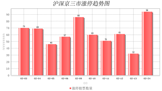今日沪深京三市一共94支股票涨停,较上一个交易的32支增加62支。