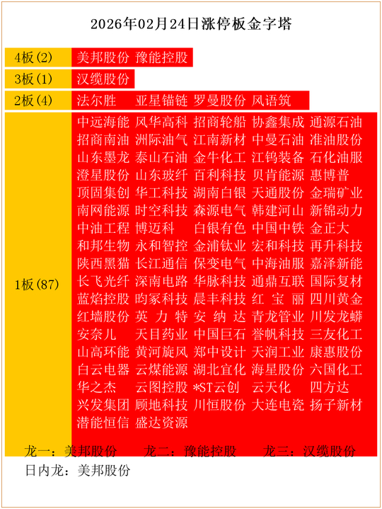 2026年02月24日涨停板连板:美邦股份、豫能控股等4板