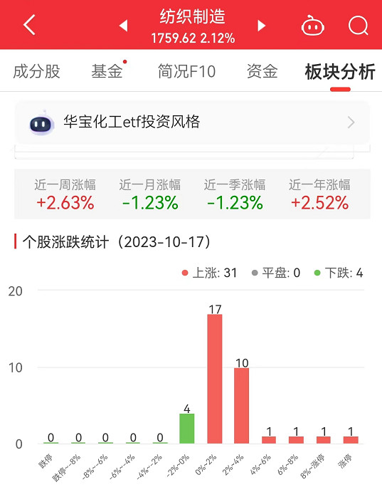 中国经济网北京10月17日讯 今日,纺织制造板块整体涨幅2.12%,其中,31只股票上涨,0只股票平盘,4只股票下跌。