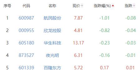 航民股份、欣龙控股、华生科技、夜光明、百隆东方位列涨幅榜后五位,涨幅分别为-1.01%、-0.82%、-0.23%、-0.16%、0.17%。
