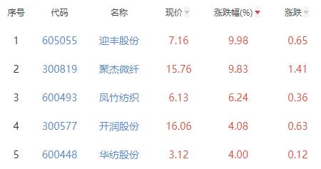 其中,迎丰股份、聚杰微纤、凤竹纺织、开润股份、华纺股份位列板块涨幅前五位,涨幅分别为9.98%、9.83%、6.24%、4.08%、4.00%。