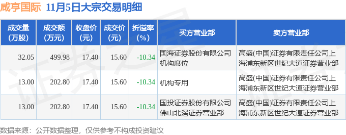 11月5日咸亨国际现3笔折价10.34%的大宗交易 合计成交905.58万元