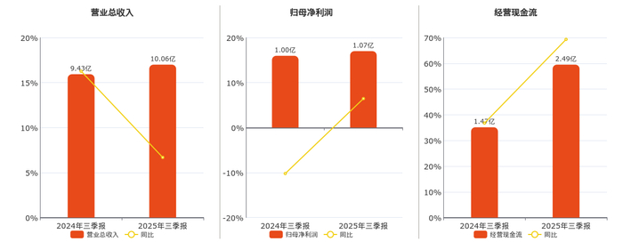 公司营业总收入为10.06亿元,在已披露的同业公司中排名第36。归母净利润为1.07亿元。经营活动现金净流入为2.49亿元。