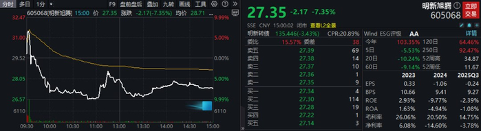 今日早间,明新旭腾股价开盘即冲击涨停,但很快就震荡下挫,由红转绿,盘中最低价报26.60元/股,距离跌停价仅差3分钱,几乎上演“天地板”,最终收跌7.35%。
