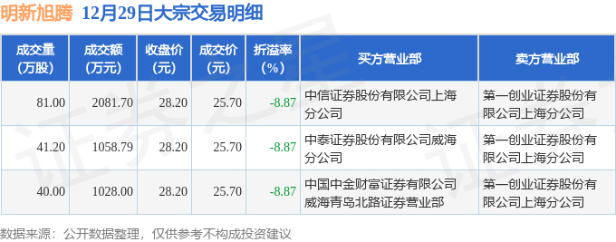 12月29日明新旭腾发生3笔大宗交易 成交金额4168.49万元