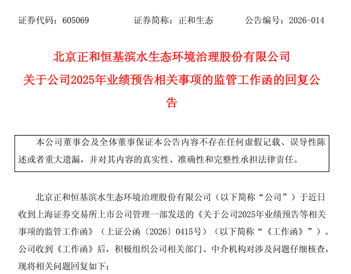 近日,北京正和恒基滨水生态环境治理股份有限公司(以下简称"正和生态",股票代码:605069)收到上海证券交易所关于2025年业绩预告相关事项的监管工作函,并就收入确认详情、分包项目毛利率偏低原因及第四季度营收异常增长等关键问题进行了详细回复。