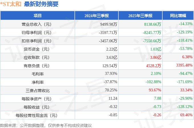 *ST太和(605081)2025年三季报简析:净利润同比下降129.19%,三费占比上升明显