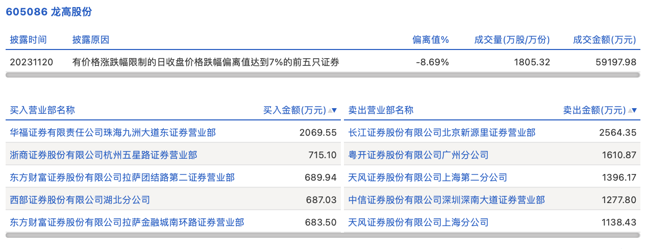 11月20日,龙高股份今日跌8.23%,全天换手率达35.29%,振幅达9.15%。龙虎榜数据显示,营业部席位合计净卖出3142.5万元。其中,长江证券北京新源里证券营业部、粤开证券广州分公司分别卖出2564.35万元、1610.87万元;华福证券珠海九洲大道东证券营业部、浙商证券杭州五星路证券营业部分别买入2069.55万元、715.10万元。