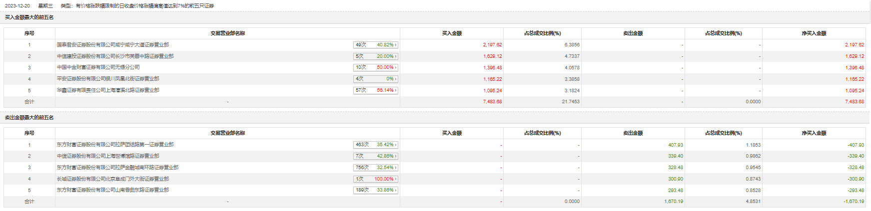 12月20日,龙高股份今日涨停,全天换手率达20.03%,振幅达8.59%。龙虎榜数据显示,营业部席位合计净买入5813.48万元。其中,国泰君安证券咸宁咸宁大道证券营业部、中信建投证券长沙市芙蓉中路证券营业部分别买入2197.62万元、1629.12万元;东方财富证券拉萨团结路第一证券营业部、中信证券上海世博馆路证券营业部分别卖出407.93万元、339.4万元。
