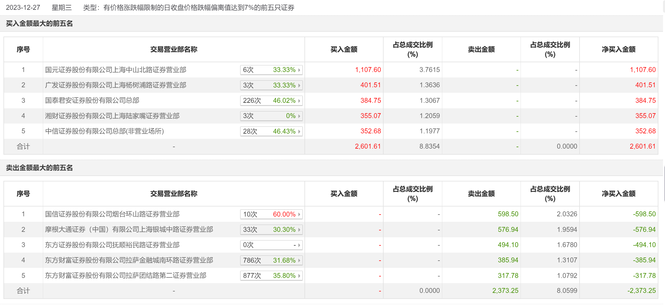 12月27日,龙高股份今日跌停,全天换手率达20.48%,振幅达8.58%。龙虎榜数据显示,营业部席位合计净买入228.36万元。其中,国信证券烟台环山路证券营业部、摩根大通上海银城中路证券营业部分别卖出598.50万元、576.94万元;国元证券上海中山北路证券营业部、广发证券上海杨树浦路证券营业部分别买入1107.60万元、401.51万元。