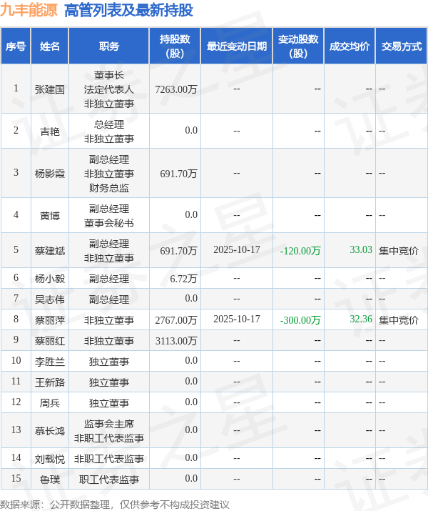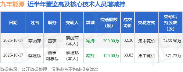 证券之星消息,根据10月17日市场公开信息、上市公司公告及交易所披露数据整理,九丰能源(605090)最新董监高及相关人员股份变动情况:2025年10月17日公司董事,副总裁蔡建斌、董事蔡丽萍共减持公司股份420.0万股,占公司总股本为0.6041%。变动期间公司股价下跌1.91%,10月17日当日收盘报33.4元。