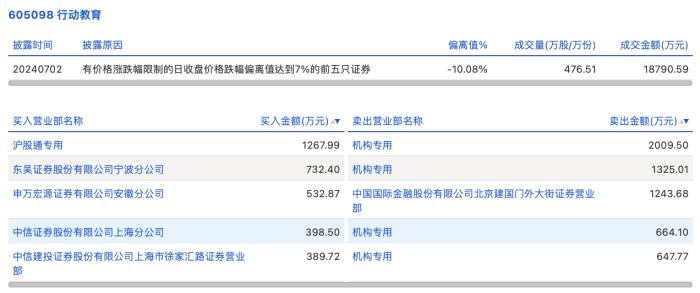 7月2日,行动教育今日跌停,龙虎榜数据显示,上榜营业部席位全天成交9211.54万元,占当日总成交金额比例为49.02%。其中,买入金额为3321.48万元,卖出金额为5890.06万元,合计净卖出2568.58万元。