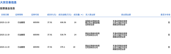 11月19日,行动教育大宗交易成交40万股,成交额1516.4万元,占当日总成交额的30.85%,成交价37.91元,较市场收盘价40.77元折价7.01%。