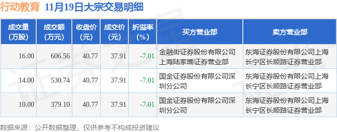 证券之星消息,11月19日行动教育发生大宗交易,交易数据如下: