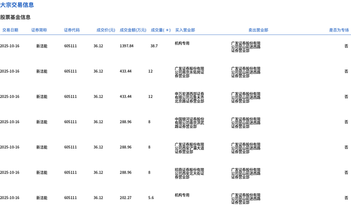 10月16日,新洁能大宗交易成交92.3万股,成交额3333.87万元,占当日总成交额的0.97%,成交价36.12元,较市场收盘价40.37元折价10.53%。