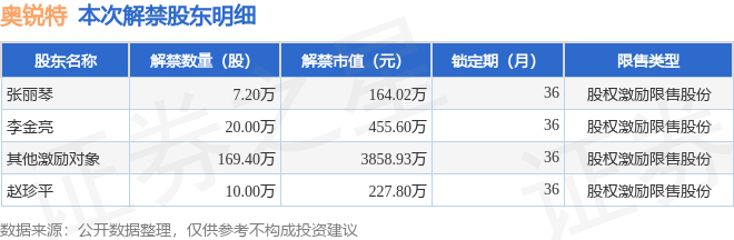 奥锐特(605116)206.6万股限售股将于11月7日解禁,占总股本0.51%