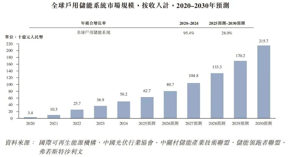 根据弗若斯特沙利文(Frost & Sullivan)报告,全球户用储能系统市场的市场规模由2020年的34亿元人民币增至2024年的502亿元人民币,复合年增长率达95.4%。预计市场规模将持续扩大,从2025年的627亿元人民币增长至2030年的2,157亿元人民币,对应复合年增长率为28.0%。