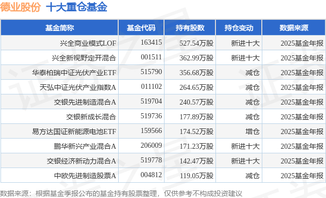 重仓德业股份的前十大公募基金请见下表: