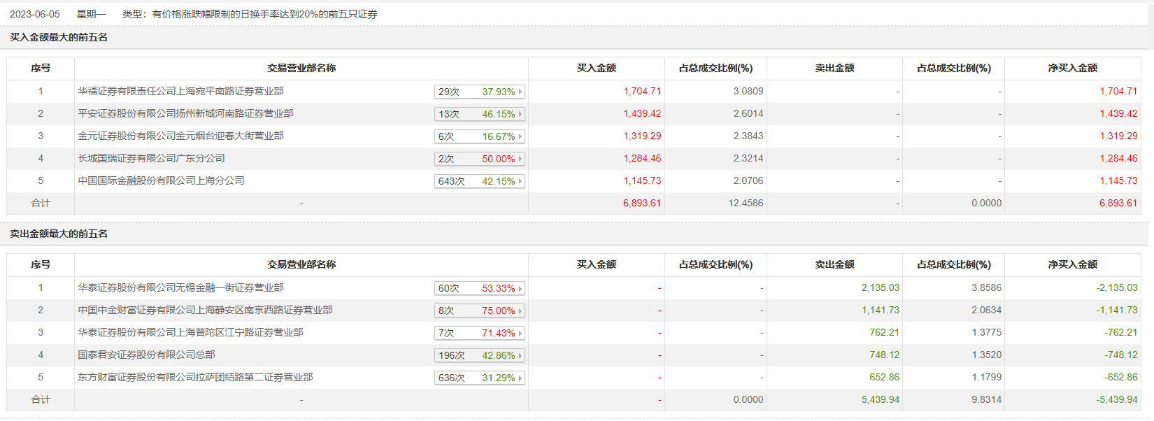 具体来看,华福证券上海宛平南路证券营业部、平安证券扬州新城河南路证券营业部分别买入1704.71万元、1439.42万元;华泰证券无锡金融一街证券营业部、中国中金财富证券有限公司上海静安区南京西路证券营业部分别卖出2135.03万元、1141.73万元。