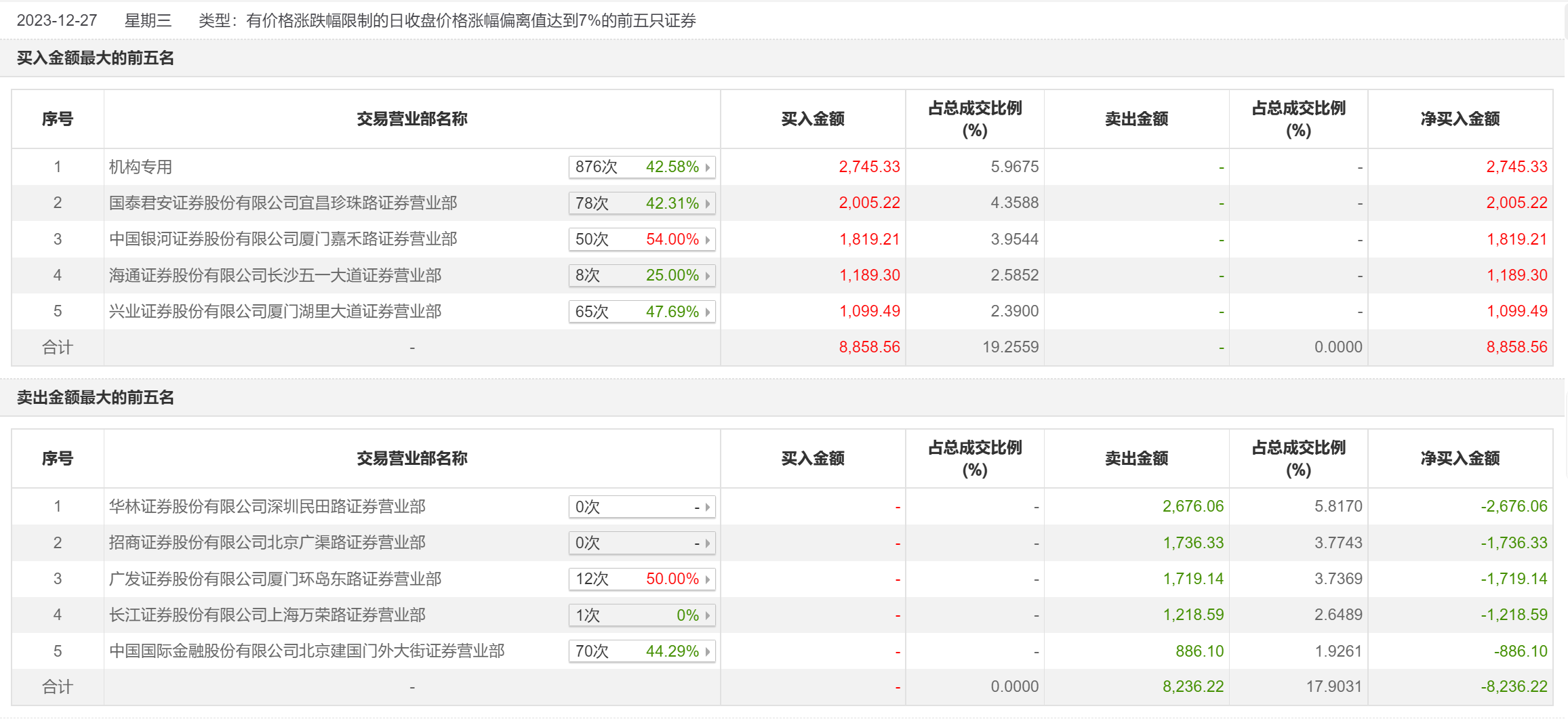 12月27日,力鼎光电今日涨停,全天换手率达5.73%,振幅达10.57%。龙虎榜数据显示,营业部席位合计净买入622.34万元。其中,机构合计净买入2745.33万元。此外,国泰君安证券宜昌珍珠路证券营业部、中国银河证券厦门嘉禾路证券营业部分别买入2005.22万元、1819.21万元;华林证券深圳民田路证券营业部、招商证券北京广渠路证券营业部分别卖出2676.06万元、1736.33万元。