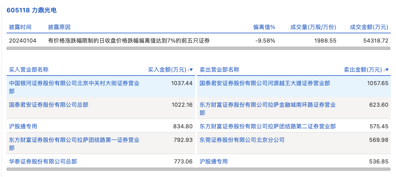 1月4日,力鼎光电今日跌停,龙虎榜数据显示,上榜营业部席位全天成交7823.91万元,占当日总成交金额比例为14.4%。其中,买入金额为4460.38万元,卖出金额为3363.53万元,合计净买入1096.85万元。