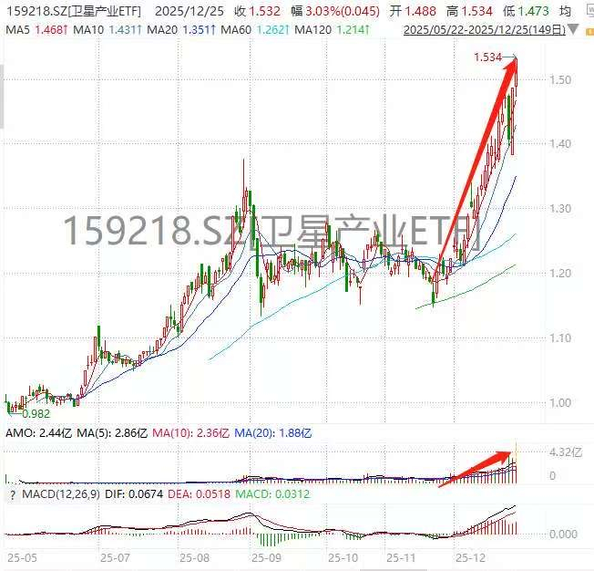 12月25日,商业航天概念股持续发酵。数据显示,截至10时25分,表征板块的卫星产业ETF(159218)放量涨2.96%,盘中创年内第29次新高;成分股长江通信、派克新材封死涨停!资金热度不减,据Wind Level2实时行情结合均价预估,盘中净流入超1亿。