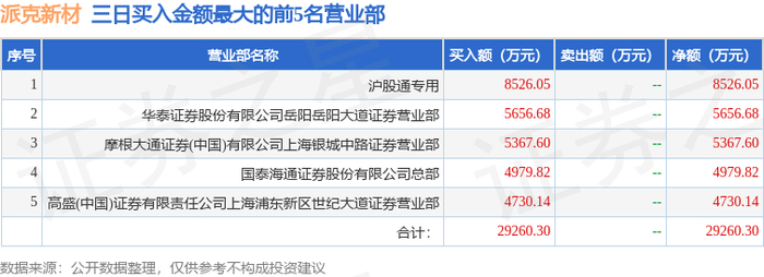 12月29日派克新材(605123)龙虎榜数据:北向资金净买入2619.41万元(3日)