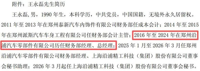 自2016年起,他在上海沿浦子公司郑州沿浦汽车零部件公司,从财务经理做到总经理,具备经营管理经验。在升任董秘前,他已担任了一年多的董秘助理,算是完成了“岗前培训”。