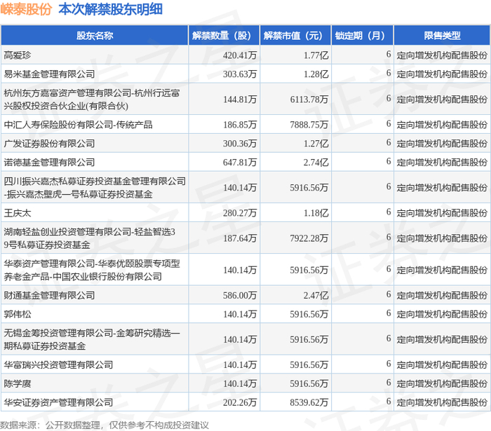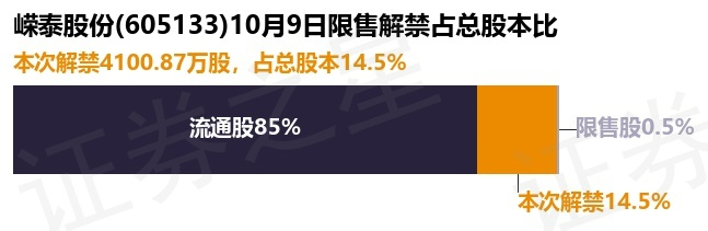 嵘泰股份(605133)4100.87万股限售股将于10月9日解禁,占总股本14.5%