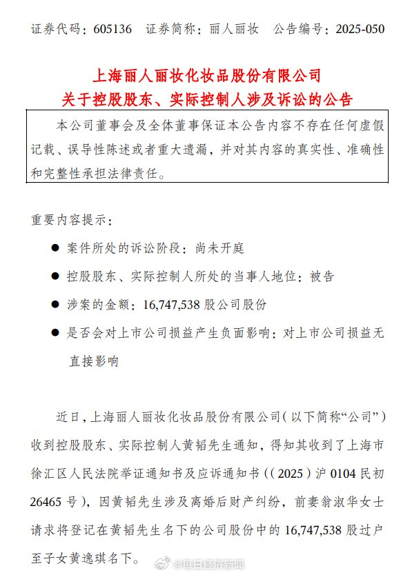 【#丽人丽妆实控人黄韬被起诉#,前妻要求将1674万股过户至子女】9月29日,丽人丽妆发布公告称,公司收到控股股东、实际控制人黄韬通知,其收到了上海市徐汇区人民法院举证通知书及应诉通知书((2025)沪0104民初26465号),因黄韬涉及离婚后财产纠纷,前妻翁淑华请求将登记在黄韬名下的公司股份中的1674.7538万股过户至子女黄逸琪名下。