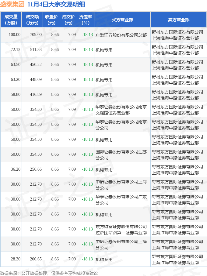 11月4日盛泰集团现16笔折价18.13%的大宗交易 合计成交5474.34万元